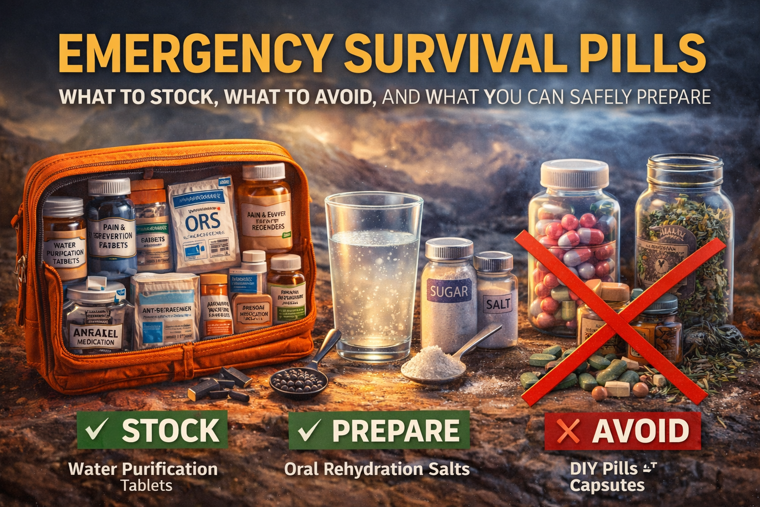 True emergency preparedness focuses on clean water access, electrolyte balance, infection prevention, temperature and pain control, and continuity of existing medical care. Pills are only one small part of survival.